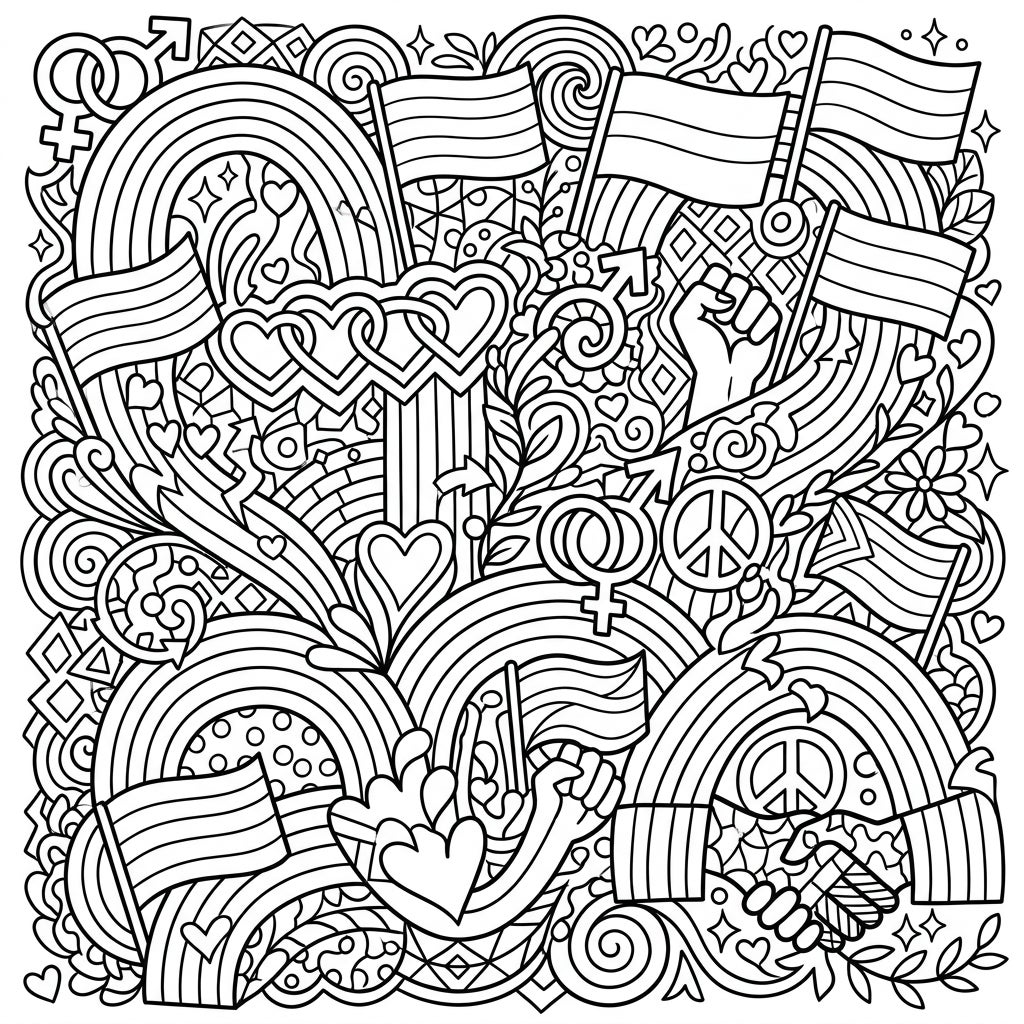 Unleash your creativity with this captivating abstract art coloring page, a celebration of Pride Month designed with teens in mind. This intricate illustration is a kaleidoscope of meaningful symbols, including numerous waving rainbow flags and flags representing different facets of the LGBTQ+ community, alongside graceful rainbows that arc across the canvas. Interlocking hearts, peace signs, and the powerful image of a raised fist are seamlessly woven into the complex design, creating a rich tapestry of visual storytelling.