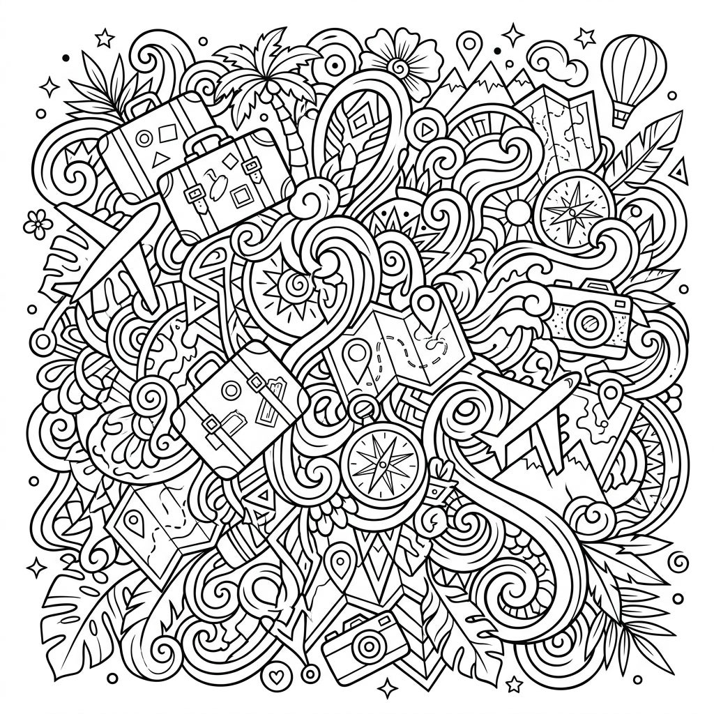 Embark on a creative journey with this captivating abstract art coloring page, bursting with intricate travel and vacation-themed doodles. Discover suitcases, maps, airplanes, and exotic foliage woven into a complex, satisfying design ready for your personal touch.