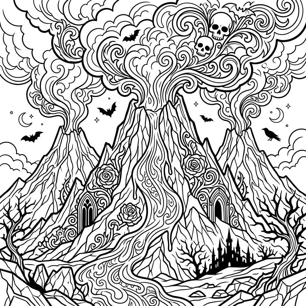 Journey into a realm where active volcanoes meet a mesmerizing Gothic aesthetic in this unique coloring page. Explore intricate details of erupting peaks, swirling smoke, and a landscape steeped in dark fantasy.