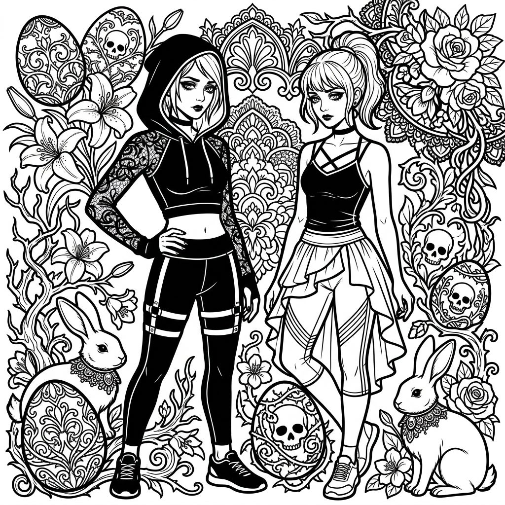 Step into an extraordinarily detailed coloring experience featuring two chic figures adorned in contemporary activewear. One sports a sleek hooded crop top with intricate lace sleeves and form-fitting leggings, while the other dons a sporty tank top paired with a unique ruffled skirt over leggings. They are framed by a rich tapestry of gothic-inspired Easter motifs, including elaborately patterned Easter eggs, some bearing skull designs, elegant rabbits with ornate collars, and a dense backdrop of swirling Victorian lace and blossoming lilies.