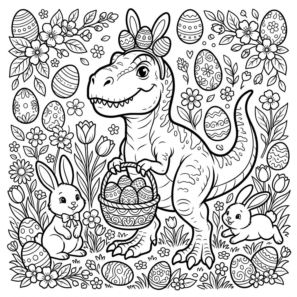 Unleash your creativity with this unique Easter coloring page, where a friendly T-Rex takes center stage in a whimsical spring scene. Our magnificent dinosaur sports playful bunny ears adorned with miniature Easter eggs, adding a touch of humor to its powerful presence. In its hand, it carefully carries a charming basket overflowing with intricately designed Easter eggs, ready for a festive hunt.