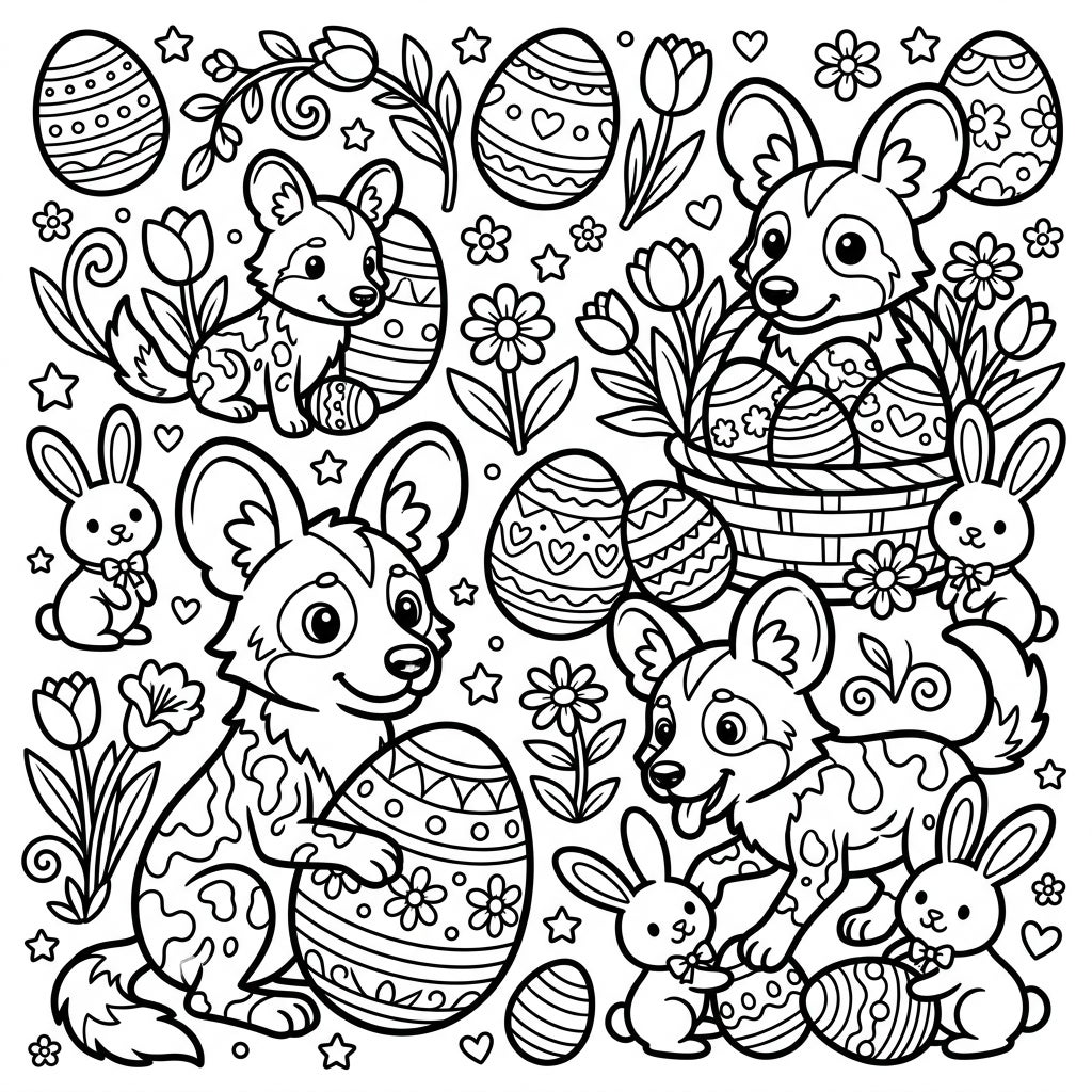 Dive into a charming Easter scene featuring playful African Wild Dogs, fluffy bunnies, and beautifully decorated eggs. This delightful coloring page is perfect for celebrating the season with creativity and joy.