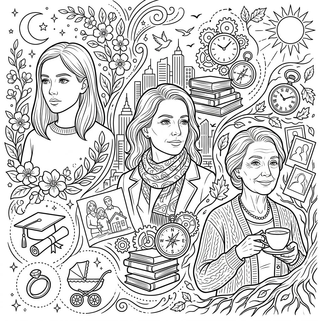 This intricate coloring template offers a poignant visual narrative of life's passage, centered around an 'Ageing Self-Portrait.' The design beautifully illustrates a woman at three distinct stages: a youthful figure adorned with blossoming flowers and a crescent moon, symbolizing new beginnings and dreams; a poised, middle-aged woman against a bustling city skyline, surrounded by books and a compass, representing career, wisdom, and navigating life's path; and a serene elderly woman, holding a teacup, nestled amidst intertwining tree roots, falling leaves, and antique clocks, embodying reflection, cherished memories, and the wisdom of time.
