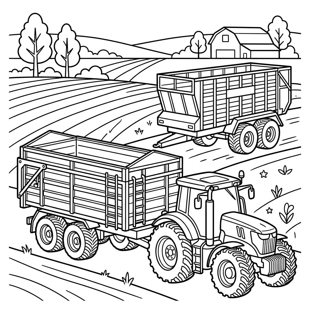 Dive into the heart of farm life with our captivating coloring page, showcasing the vital machinery that helps keep farms running! This detailed illustration features a robust tractor, ready for action, pulling a large agricultural trailer. In the background, another trailer waits its turn amidst rolling fields, offering a comprehensive view of farming essentials.