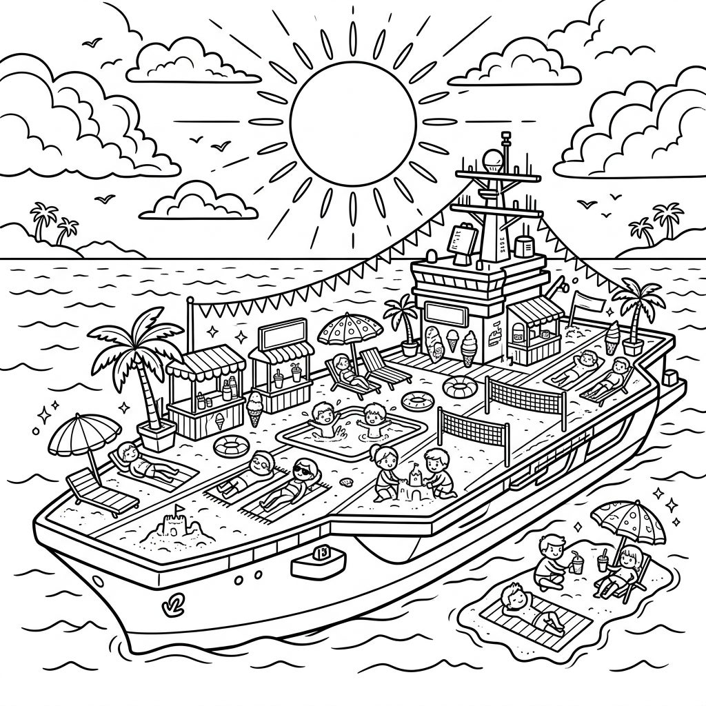 This extraordinary coloring page presents a detailed black-and-white illustration of an aircraft carrier repurposed as a vibrant summer resort. Its spacious deck is bustling with activity, featuring a refreshing swimming pool, inviting lounge chairs for sunbathers, playful sandcastles, and charming ice cream and snack stands. Palm trees sway, umbrellas provide shade, and a lively volleyball net adds to the festive atmosphere, all set against a backdrop of a bright sun, fluffy clouds, and distant tropical islands.