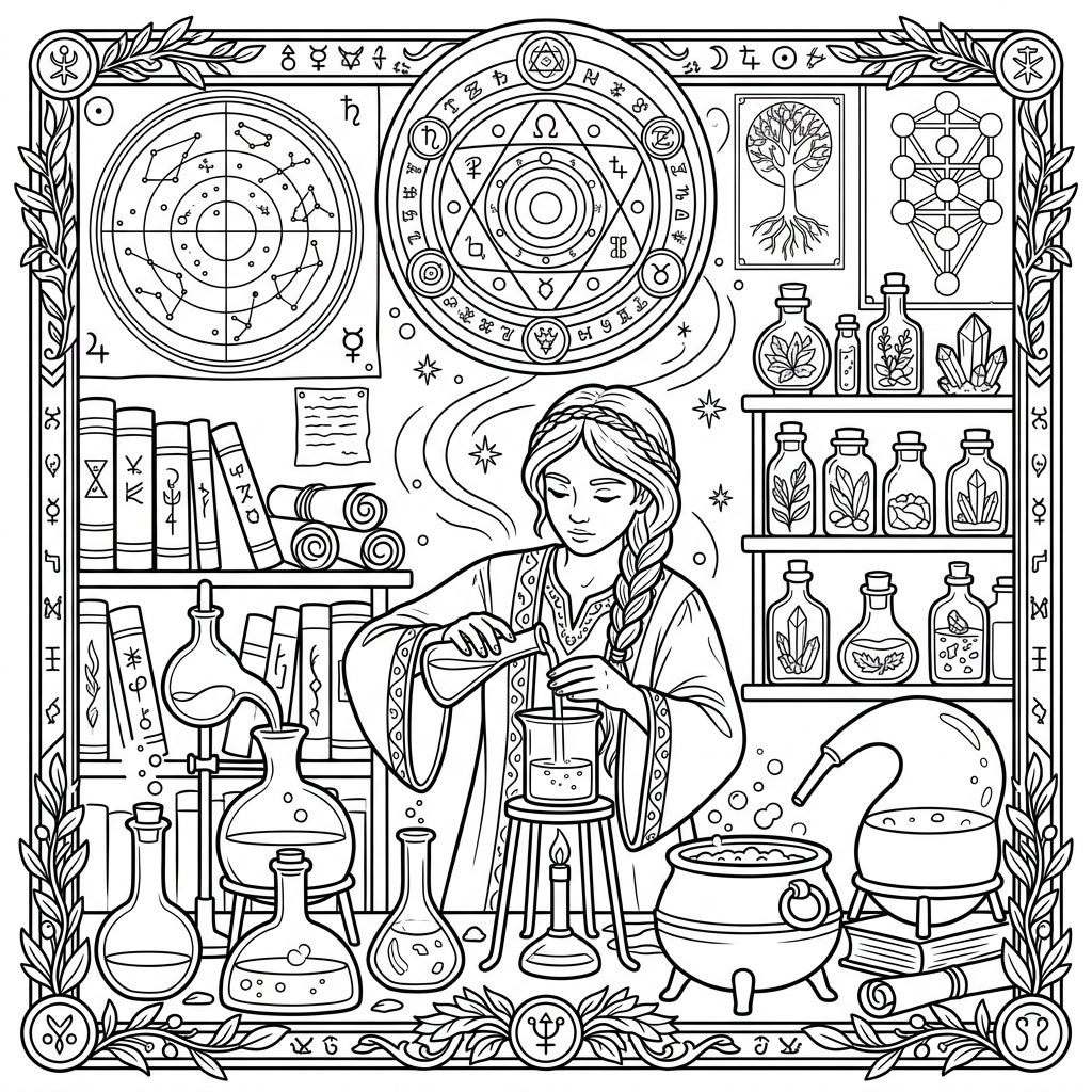 Step into the intricate world of an alchemist's laboratory with this beautifully detailed coloring page, perfectly sized to become a magical bookmark. The central figure, a focused alchemist with braided hair, diligently performs a delicate pour, surrounded by the tools of her trade. Explore shelves brimming with ancient books and cryptic scrolls, alongside a fascinating array of flasks, bubbling beakers, and mysterious bottles filled with potions and sparkling crystals. Every element, from the glowing flame beneath the beaker to the ornate leafy border, is meticulously drawn to offer a rich and engaging coloring experience.