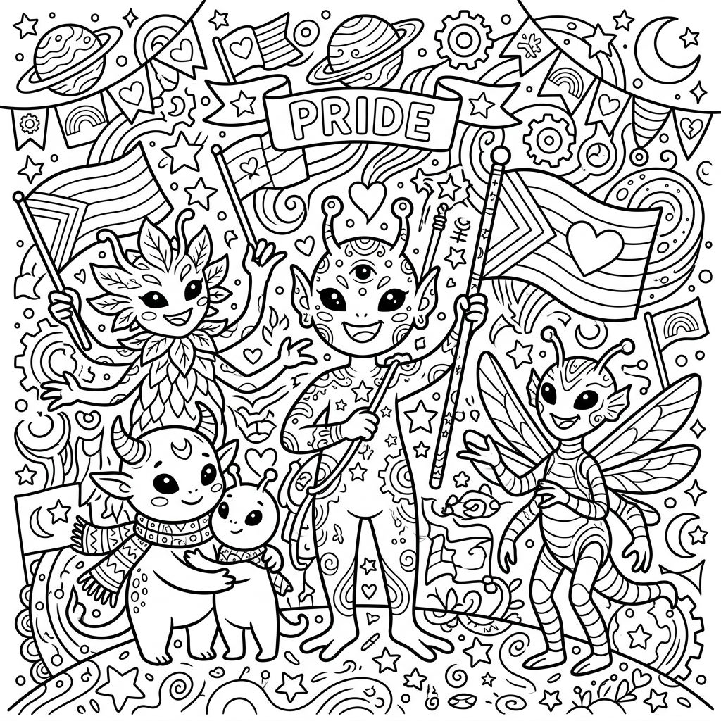 Dive into a universe of creativity with this intricate coloring page, showcasing a lively Pride celebration led by a diverse crew of Alien Time Travelers. Discover a playful plant-like alien, a charismatic three-eyed extraterrestrial, a cuddly horned creature alongside a smaller companion, and a charming winged alien, all interacting amidst a cosmic backdrop. Each character proudly brandishes flags adorned with hearts and stripes, while a prominent banner proclaims 'PRIDE' at the center, inviting you to infuse these designs with your favorite colors.