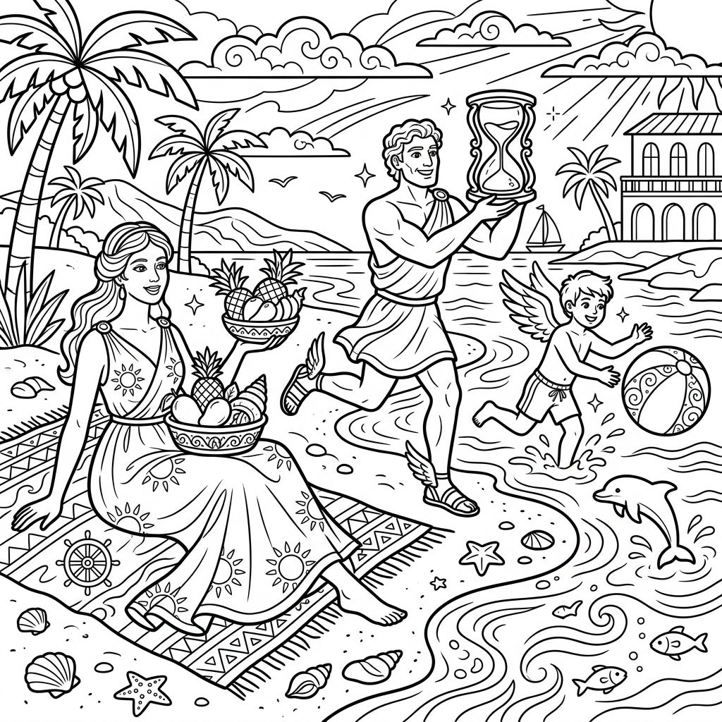 Step into a world where ancient allegories meet modern summer fun with this captivating coloring page. Imagine vibrant hues filling a sun-drenched beach scene, featuring serene figures enjoying a tropical paradise.