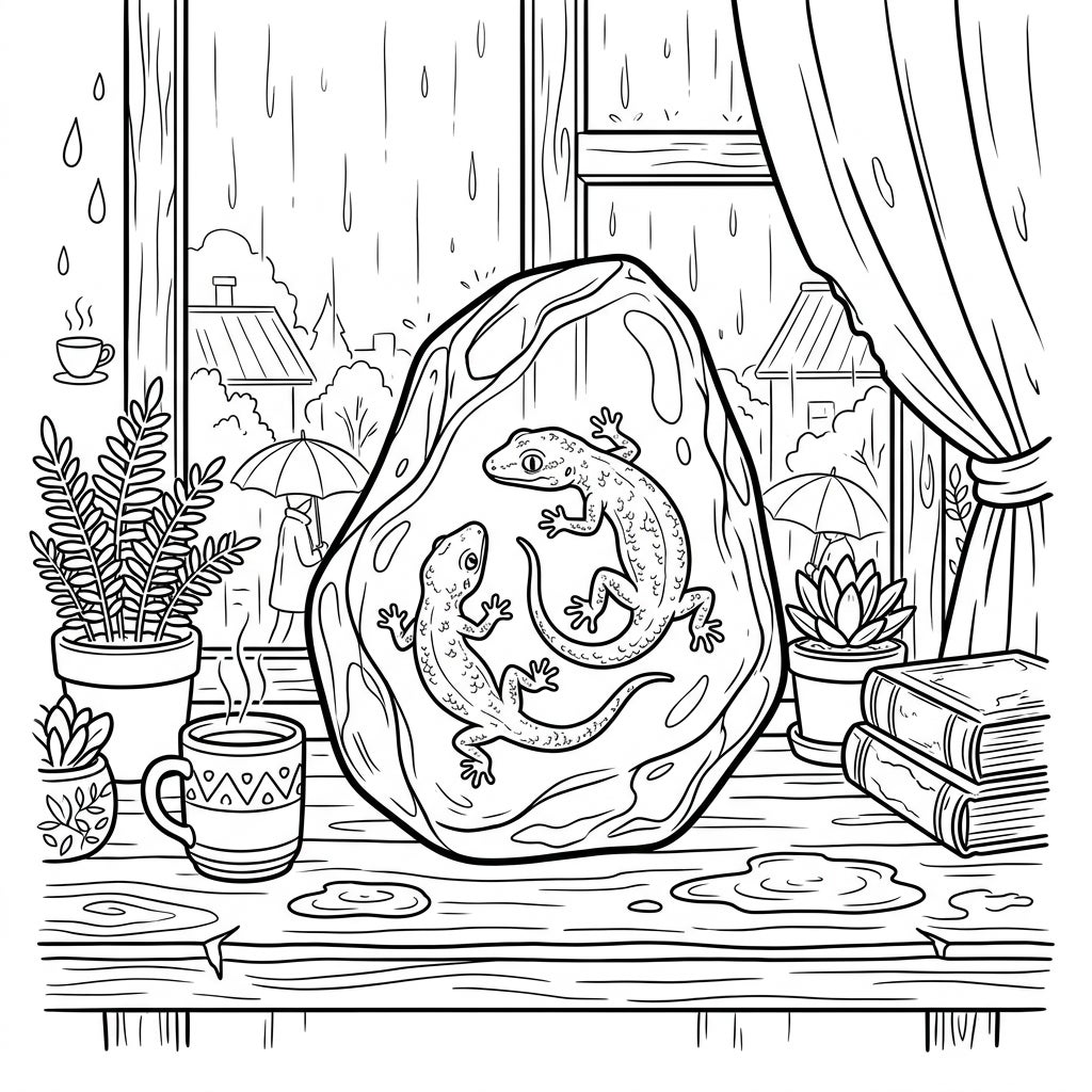Bring this unique scene to life with your palette, perhaps using warm golden and amber tones for the fossil, contrasted with earthy greens and browns for the lizards' scales to make them truly pop. Experiment with cool blues and grays for the rainy sky and window, and add touches of vibrant color to the potted plants and patterned mug. Don't forget to highlight the reflective puddles on the windowsill. Let your imagination guide you in transforming this intricate illustration into your personal masterpiece.