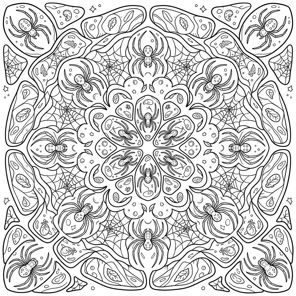 Experience the perfect fusion of natural wonder and geometric precision. The radial symmetry of this mandala creates a deeply meditative coloring experience, allowing you to lose yourself in the detailed patterns. Imagine bringing to life the glow of amber, the sheen of spider silk, and the subtle textures of fossilized flora, transforming this unique artwork into a vibrant masterpiece.