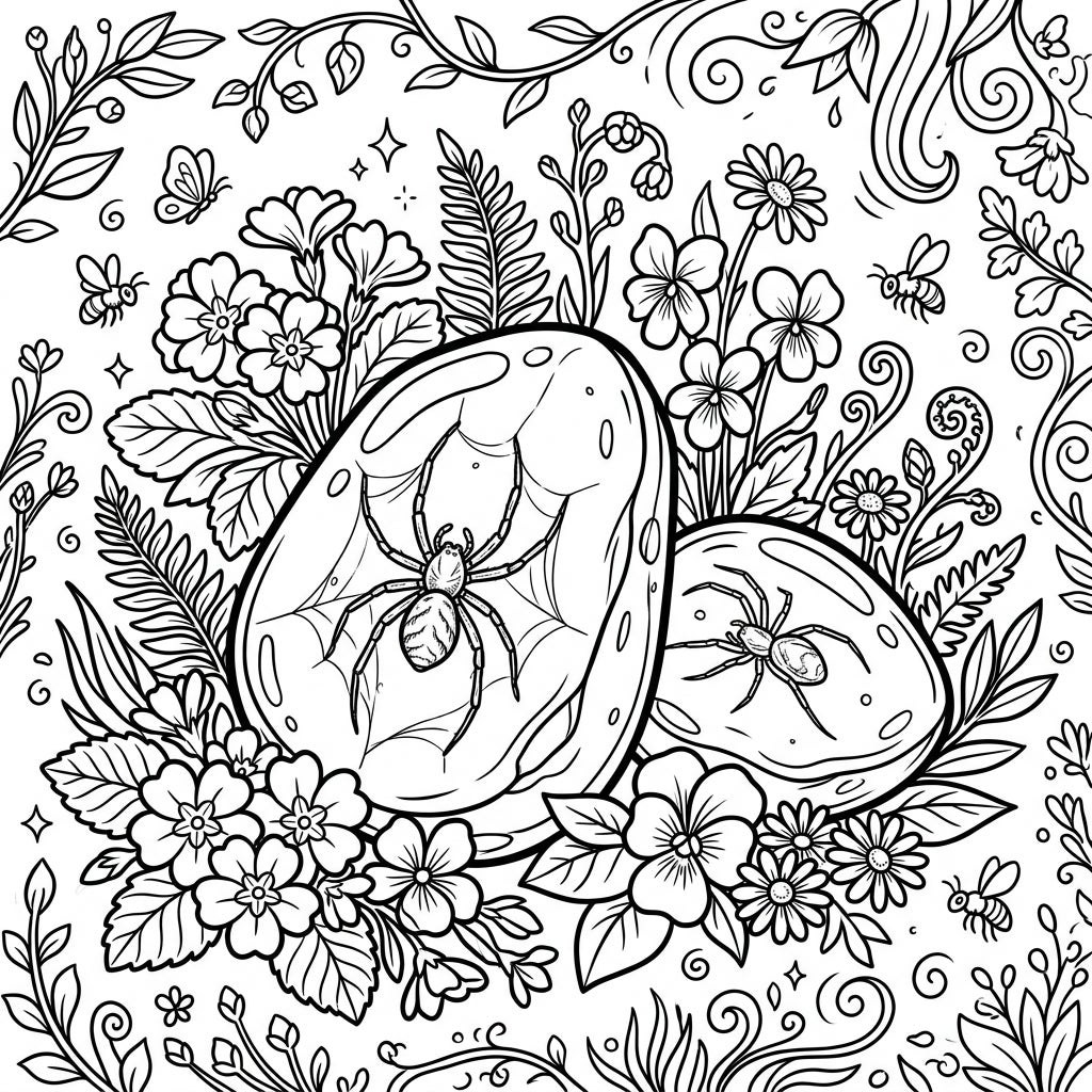 Delve into a captivating coloring journey with this intricately designed page. At its heart lie two remarkable amber stones, each flawlessly preserving a fossilized spider within its ancient embrace, complete with delicate web strands. These natural wonders are surrounded by a bountiful tapestry of spring's finest, including diverse blooming flowers like daisies and primroses, fresh green leaves, swirling botanical vines, a graceful butterfly, and busy little bees, all rendered in exquisite line art awaiting your personal color palette.