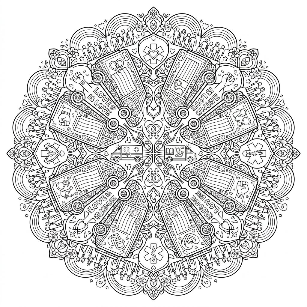 This unique mandala isn't just about intricate patterns; it's a heartfelt celebration of Pride Month and the spirit of care. By combining the life-saving symbols of ambulances with themes of love, diversity, and community, this page becomes a powerful tribute to inclusivity. It represents support for all, echoing the vital role emergency services play in our society while honoring the universal message of acceptance that defines Pride.