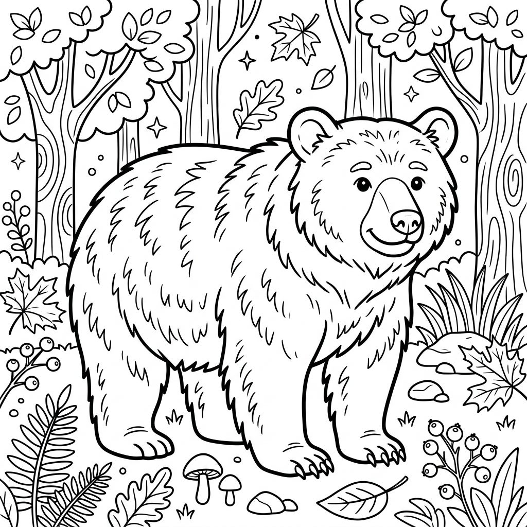 Encourage your little one to experiment with colors to truly bring this forest friend to life! Will the bear be a classic black, or will they imagine a brown phase? Suggest vibrant greens for the leaves and ferns, earthy browns for the tree trunks, and perhaps bright reds or purples for the berries and mushrooms. This page's balanced line weight and moderate details are perfect for building fine motor skills and confidence in coloring.