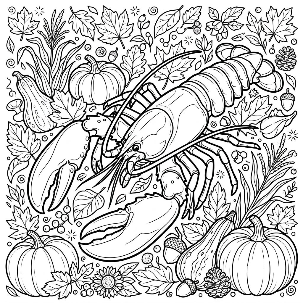 Celebrate the bounty of autumn with this unique American Lobster coloring page, nestled among classic fall harvest elements. Immerse yourself in a world of crisp leaves, plump pumpkins, and a majestic lobster, ready for your creative touch.