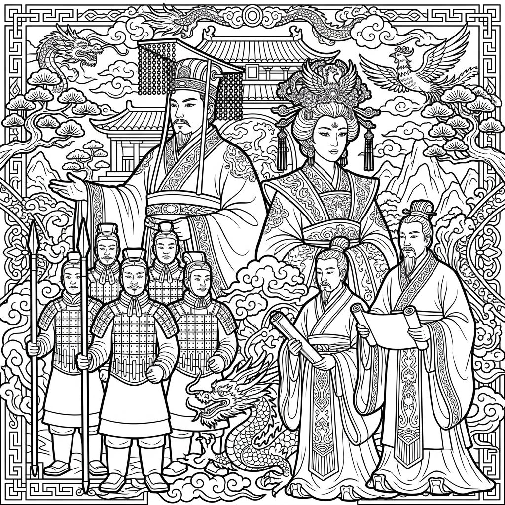 This intricate coloring page invites you to explore the rich tapestry of ancient Chinese dynasties. At its heart stand commanding figures: a regal Emperor in his flowing robes and distinctive headwear, an elegant Empress adorned with an elaborate phoenix crown, and a disciplined line of soldiers in period-accurate armor. Alongside them, wise scholars hold scrolls, surrounded by symbolic elements like majestic dragons, a soaring phoenix, and traditional Chinese architecture, all framed by an elegant, patterned border.
