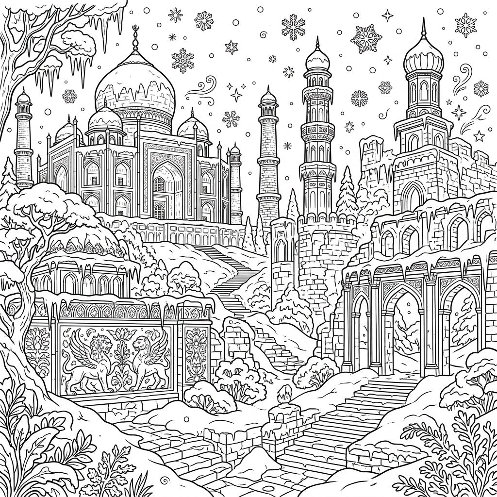 Dive into a breathtaking scene where history meets winter's embrace. This intricate coloring page showcases a magnificent ancient palace, reminiscent of the iconic Taj Mahal, standing grandly amidst a snow-covered landscape. Adjacent to it, stately minarets and crumbling fortress walls, adorned with frosty arches and intricate details, hint at forgotten tales. Notice the decorative wall in the foreground featuring two powerful winged lions, adding a mythical touch to this historical setting. Every architectural element, from the majestic domes to the ornate carvings, is meticulously rendered, offering a wealth of patterns and textures to bring to life with your chosen hues.