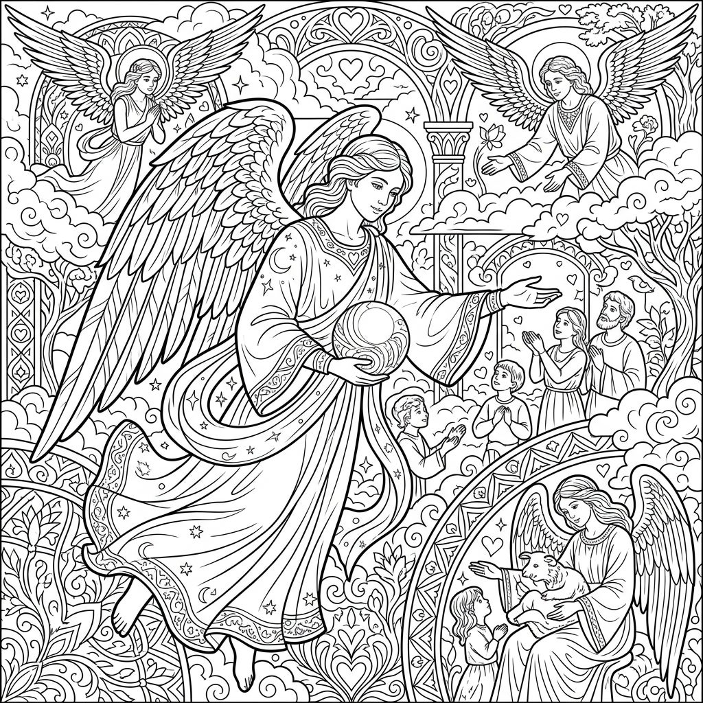 This artwork is a celebration of divine compassion, forgiveness, and benevolent intervention, perfectly captured in every stroke. As you bring color to this scene, you'll feel a sense of peace and inspiration, reflecting on the comforting presence of these celestial beings. The thoughtful arrangement of figures, including an angel cradling a lamb with a child, emphasizes themes of care and protection. It's an ideal piece for reflection, offering a creative sanctuary from the everyday, reminding us of grace and kindness.