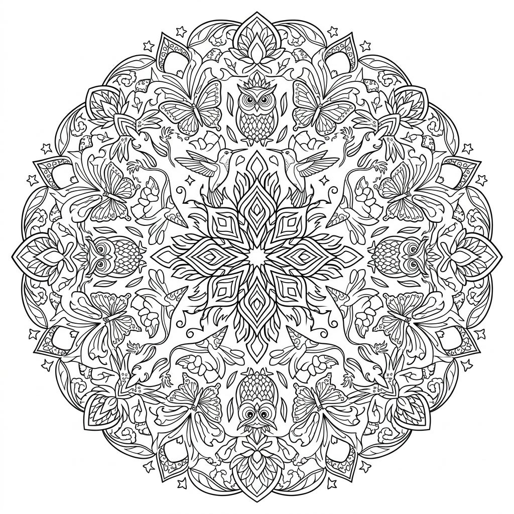 Embark on a captivating artistic journey with this exquisitely detailed Animal Mandala coloring page, crafted specifically for adults. This radially symmetrical design beautifully interweaves the wisdom of majestic owls, the delicate grace of butterflies, and the swift elegance of hummingbirds amidst a tapestry of ornate floral patterns and mystical elements. Each segment of the mandala reveals new intricate details, from swirling tendrils to tiny stars, inviting your eyes to explore every corner of its enchanting composition.