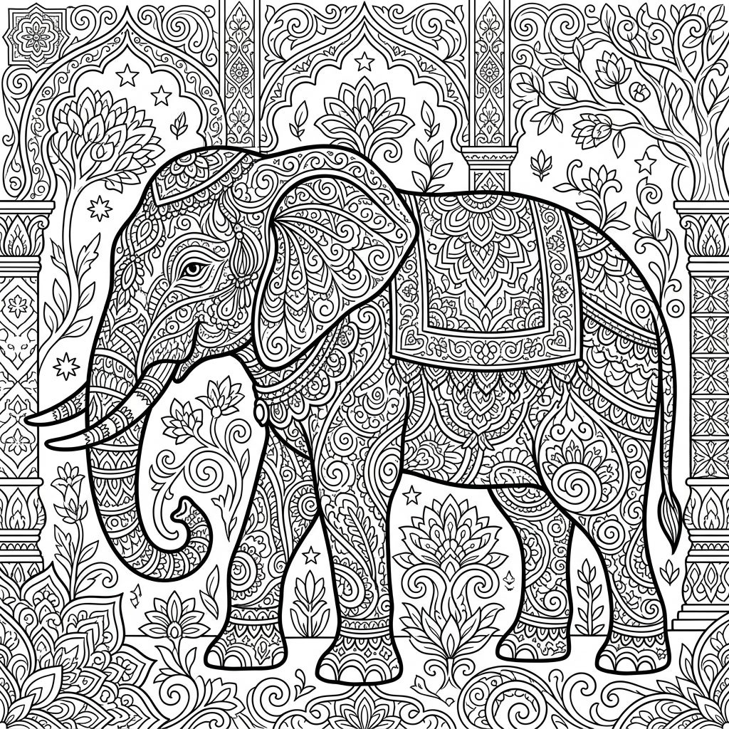Embark on an artistic journey with this magnificent elephant coloring page, designed specifically for adult enthusiasts. This intricate illustration showcases a grand elephant, its majestic form richly adorned with swirling paisley patterns, delicate floral motifs, and geometric designs reminiscent of traditional mandala art. Every inch, from its large ears to its powerful legs, is a canvas of fine lines and elaborate details, set against a stunning backdrop of ornate arches, decorative pillars, and flourishing botanical elements, creating a truly immersive scene.