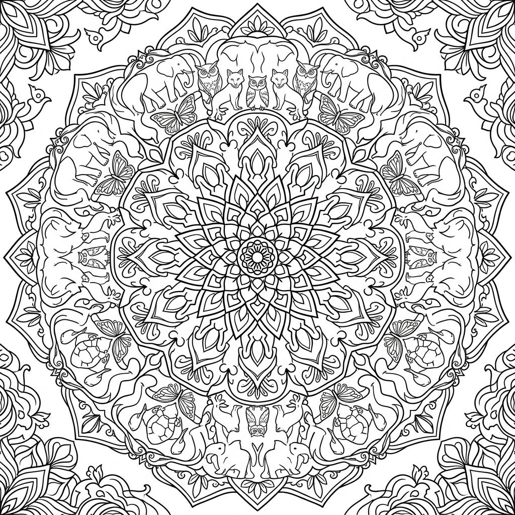 Dive into a world of symmetrical beauty with this intricate animal mandala coloring page. Featuring a harmonious blend of elephants, owls, and other creatures, it promises a truly engaging coloring experience.