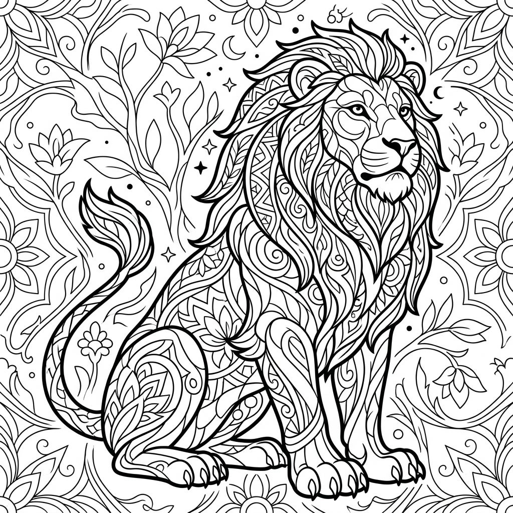 Dive into the regal world of this magnificent mandala lion coloring page. Every inch of this majestic beast is adorned with a tapestry of intricate patterns, from its flowing mane filled with swirling motifs to its powerful body detailed with delicate floral designs and abstract shapes. The lion sits proudly, its gaze contemplative, inviting you to bring its patterned glory to life with your chosen hues.