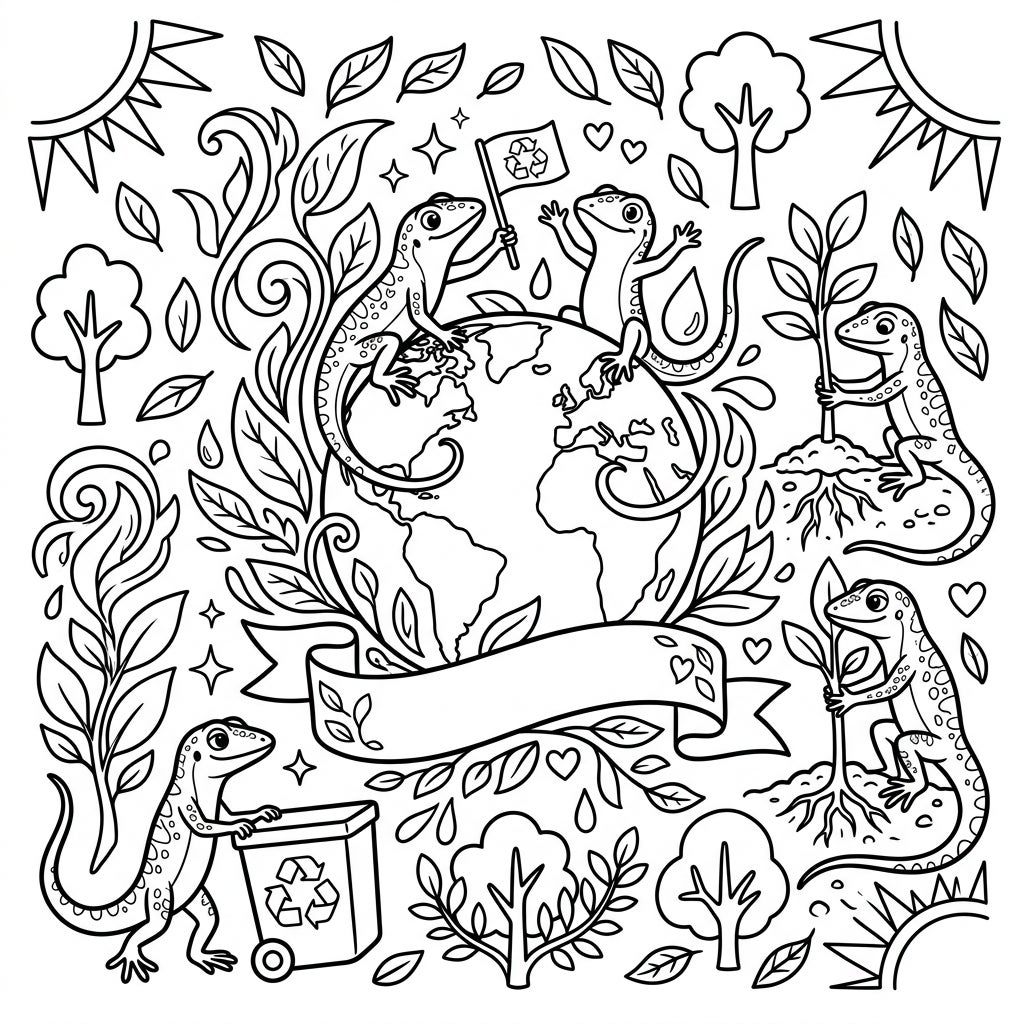 Surrounding our diligent anole friends is a rich tapestry of nature and environmental motifs, including flowing leaves, sturdy trees, beaming suns, delicate water droplets, and sweet little hearts, all symbolizing growth, care, and the interconnectedness of life. This heartwarming composition beautifully captures the spirit of Earth Day, promoting themes of ecological awareness, conservation, and the joy of contributing to a healthier planet. It's a fantastic way to engage with important environmental messages through artistic expression.