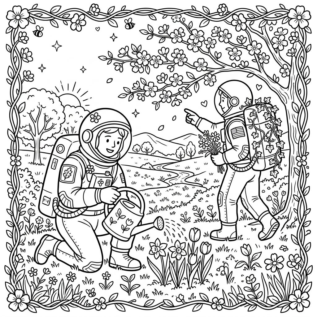 Unleash your artistic flair as you bring this delightful scene to life! Consider using a vibrant palette for the spring flowers – cheerful yellows for daffodils, rich reds for tulips, and soft pinks for cherry blossoms. The astronauts' suits offer a chance to experiment with classic white and gray, or perhaps add a futuristic metallic sheen. Don’t forget to add depth to the rolling hills and flowing stream, making this cosmic garden truly your own masterpiece. Get ready to color a world where every bloom tells a story of adventure!