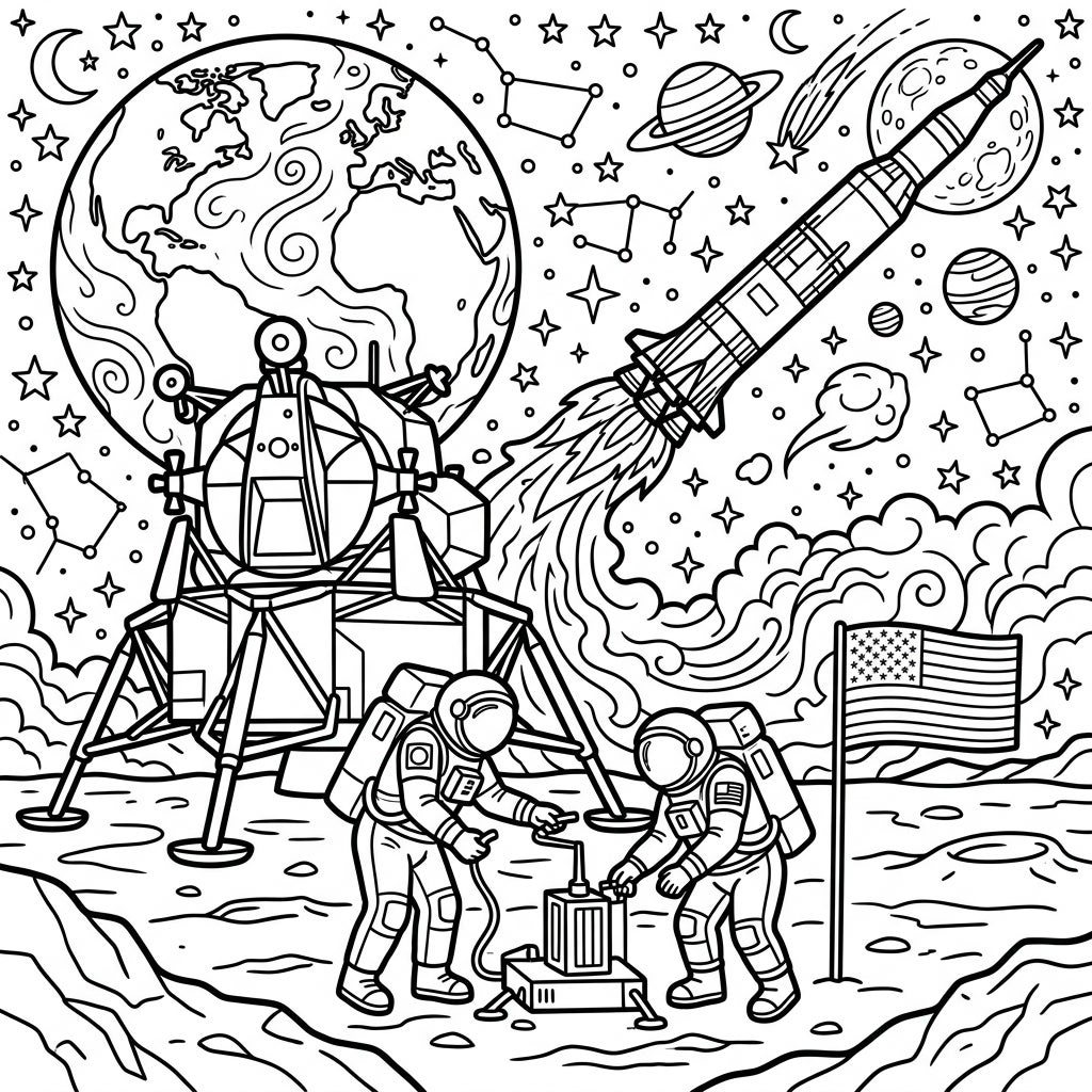 Dive into a captivating space adventure with this Apollo Missions coloring page, crafted specifically for young, aspiring astronauts. This detailed illustration brings to life the historic lunar landing, showcasing two intrepid astronauts busily working on the moon's surface beside their impressive lunar lander and a proudly planted American flag. Above them, a majestic rocket soars into the starry expanse, accompanied by a beautifully rendered Earth, twinkling stars, distant planets, and intriguing constellations, all waiting for a splash of color.