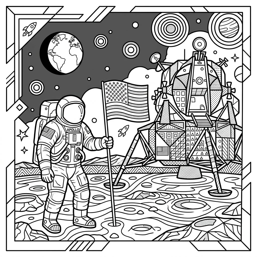 Experience the excitement of the space race through the vibrant lens of Pop Art. This dynamic design is characterized by its bold outlines, striking graphic elements, and a fascinating array of patterns – from halftone dots to geometric shapes – filling every detail of the astronaut's suit, the lunar landscape, and even the starry sky. It's a perfect blend of historical awe and artistic flair, inviting you to add your unique splash of color to this monumental achievement.