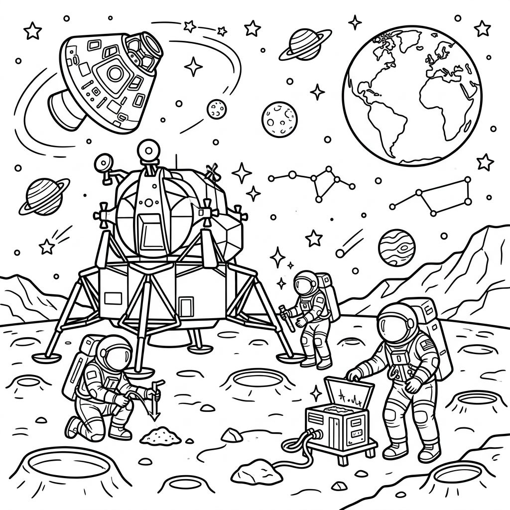 Blast off into a world of creativity with our incredible Apollo Missions coloring page! This intricate design brings to life the awe-inspiring journey to the Moon, featuring a majestic lunar module proudly standing on the crater-filled lunar surface. You'll find two diligent astronauts engaged in scientific exploration, one meticulously collecting samples and another operating advanced equipment, all set against a backdrop of cosmic wonders. Above, the command module orbits near a detailed Earth, surrounded by twinkling stars, distant planets, and familiar constellations, offering a rich tapestry of details to fill with color.