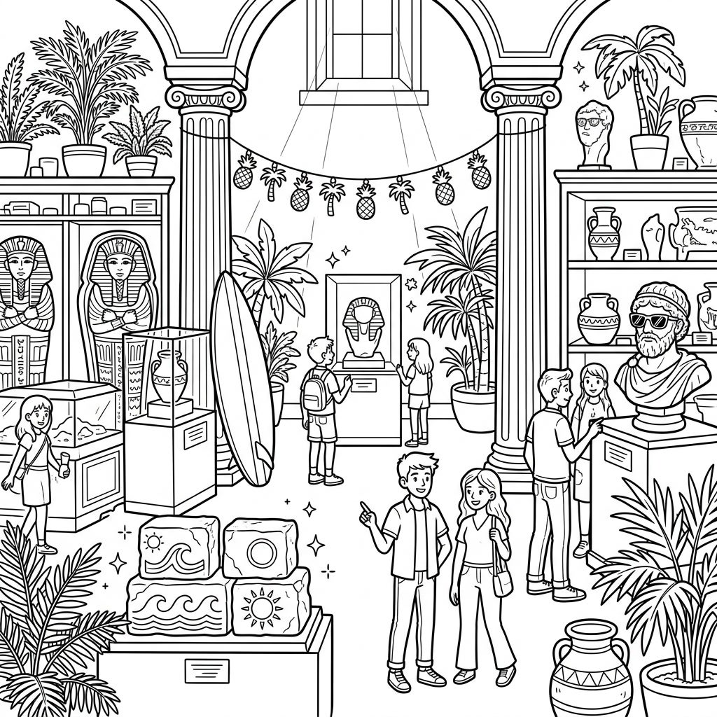 Dive into a unique blend of history and summer fun with this archaeology museum coloring page. Discover ancient artifacts alongside tropical plants, surfboards, and sunny vacation vibes, perfect for all ages.