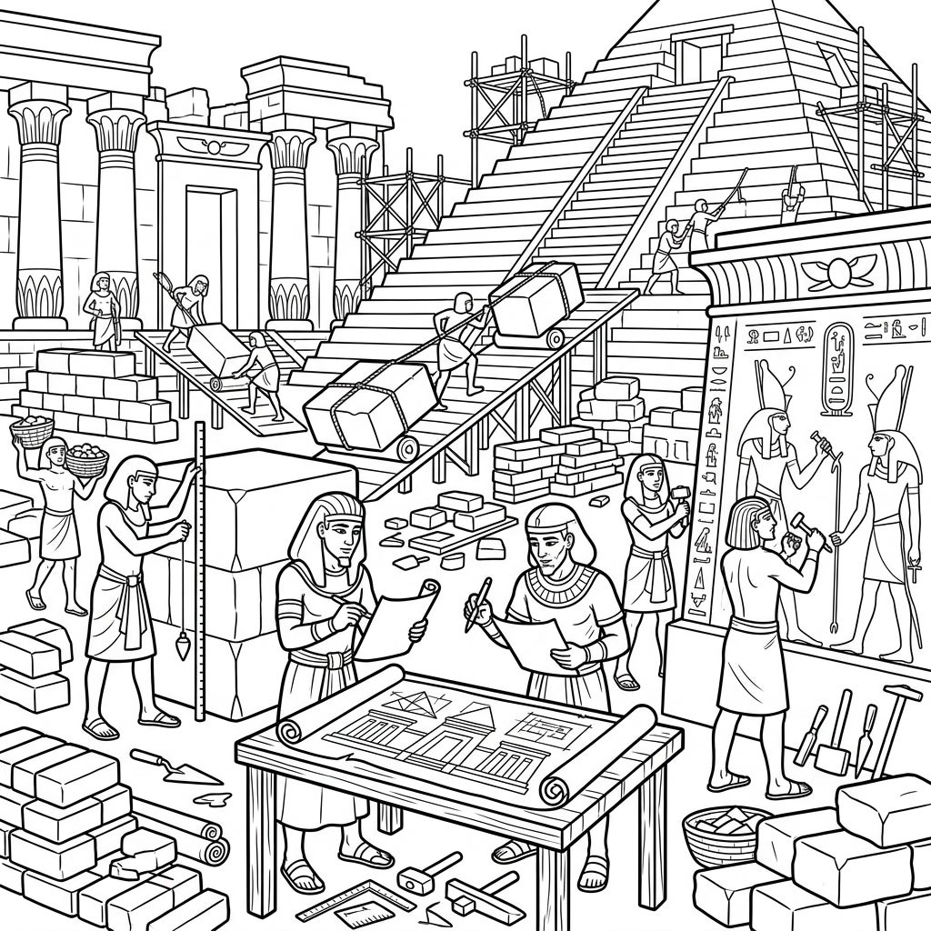 This scene captures the awe-inspiring dedication and ingenuity of ancient Egyptian civilization, celebrating their monumental architectural achievements. It invites colorists to ponder the engineering marvels and the collective human effort that shaped some of history's most iconic structures. Imagine the bustling energy of the construction site, the desert sun beating down, and the pride in creating something that would stand for millennia.
