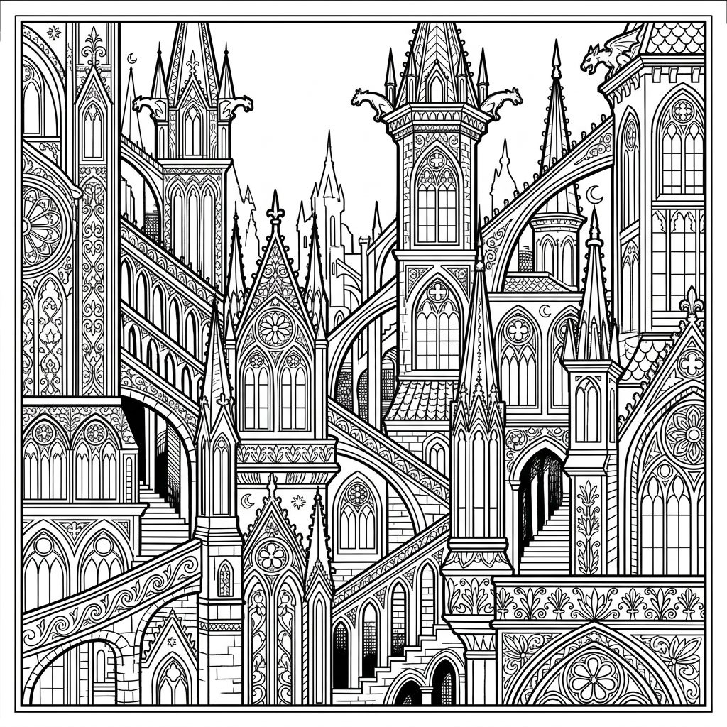 Step into a breathtaking realm of intricate design with this Gothic Architectural Art coloring page. This detailed illustration presents a sprawling cityscape or majestic castle, bursting with towering spires, pointed arches, and countless decorative elements that demand your artistic attention. Every inch of the page is a canvas, inviting you to discover hidden patterns and elaborate structures within its complex tapestry.