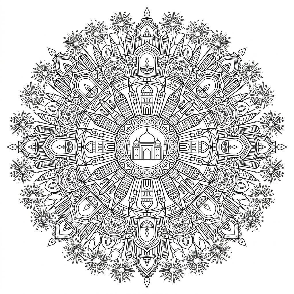 Unfold the beauty of tradition with this exquisite architectural mandala coloring page. At its heart lies a magnificent structure reminiscent of the Taj Mahal, encircled by concentric layers of ornate buildings, spires, and domes. Look closer to discover delicate diyas, flowing rangoli patterns, and bursts of fireworks, all seamlessly integrated into the grand architectural framework, creating a visually rich and perfectly symmetrical design.