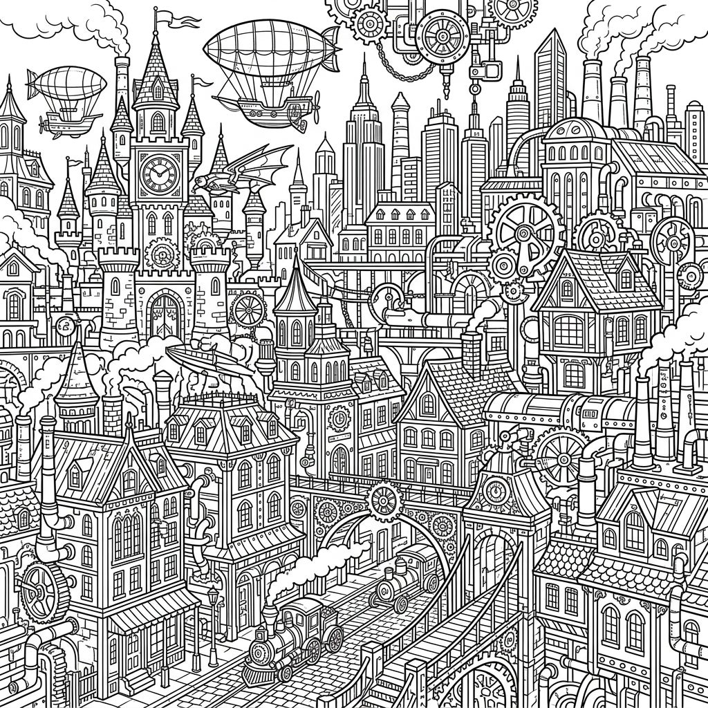Step into a magnificent industrial Victorian fantasy with this intricately designed coloring page. The sprawling cityscape is a marvel of imagination, featuring towering castles, grand old European-style buildings, and sleek modern skyscrapers, all intertwined with the iconic elements of Steampunk. Observe the complex network of pipes, the grandeur of numerous gears integrated into structures, and the majestic steam-powered airships gracefully sailing above. Every corner reveals a new detail, from bustling train tracks winding through elevated bridges to smoke billowing from countless factory chimneys, painting a vivid picture of a vibrant, steam-driven metropolis.