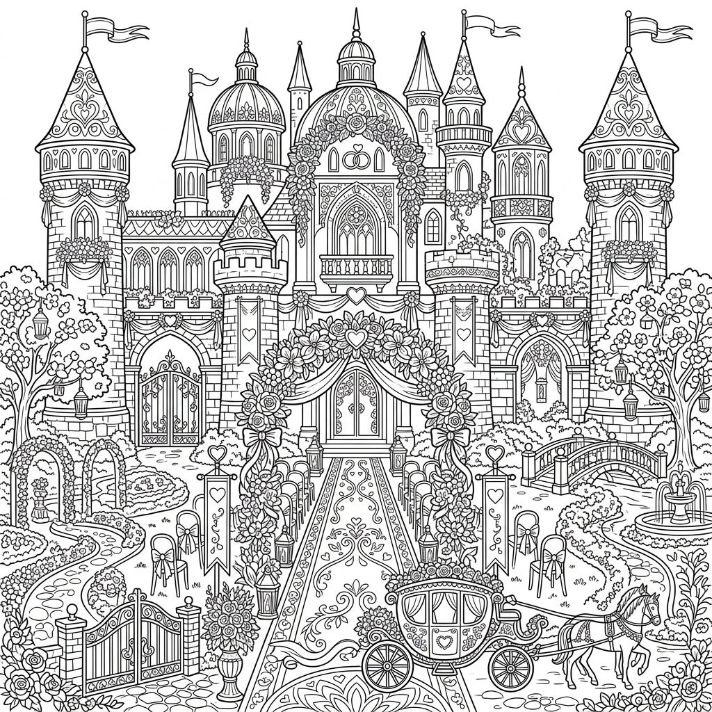Celebrate love and intricate design with this stunning adult coloring page featuring a grand castle ready for a royal wedding. Lose yourself in the majestic architecture and romantic details, perfect for a relaxing creative escape.