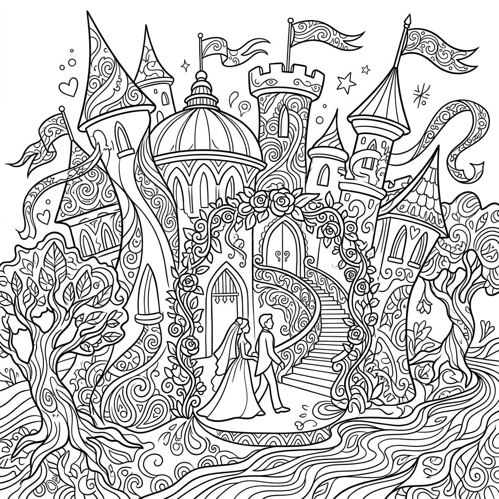 Dive into an extraordinary coloring experience with this intricate psychedelic wedding castle. Majestic spires and grand architectural forms are reimagined with swirling, organic patterns that seem to dance across every stone and turret. Flags unfurl with decorative motifs, while lush, vine-like tendrils adorned with roses entwine around the castle's entrance, creating a captivating visual tapestry that defies conventional design.