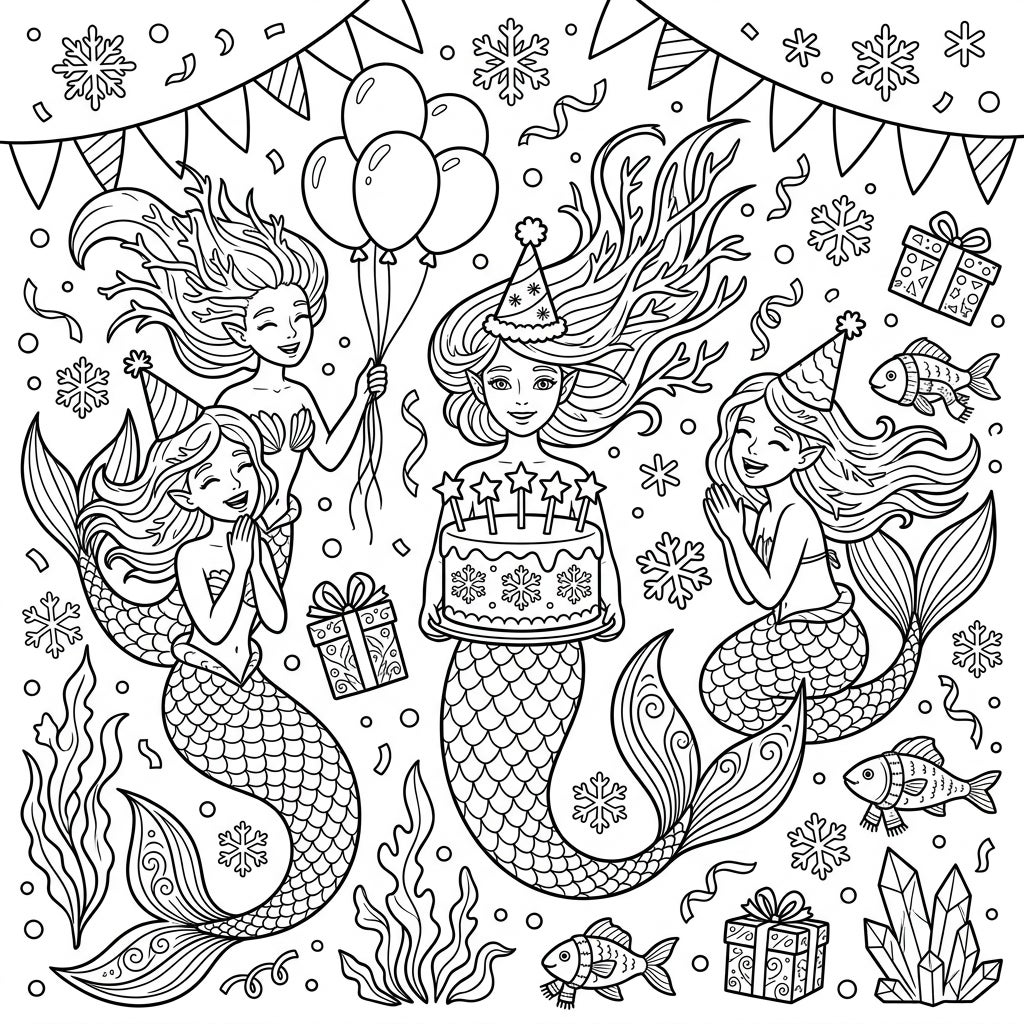 Explore a magical underwater birthday celebration with a trio of enchanting Arctic mermaids! This delightful coloring page is filled with festive details, from sparkling snowflakes to delicious cakes, ready for your creative touch.