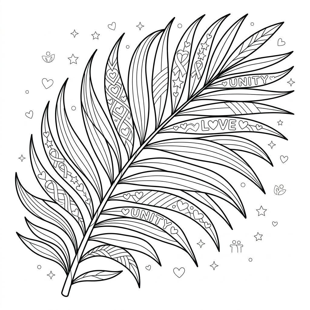 Dive into the intricate beauty of this Areca Palm Leaf coloring page, a true work of art designed to inspire. Each delicate frond of the elegant palm is meticulously patterned with symbols of affection and community, including interwoven hearts, flowing ribbons, and sparkling stars. Look closely and you'll find the empowering words 'LOVE' and 'UNITY' gracefully integrated into the leaf's design, surrounded by a scatter of small hearts, stars, and abstract shapes that fill the background, creating a rich and detailed coloring experience.