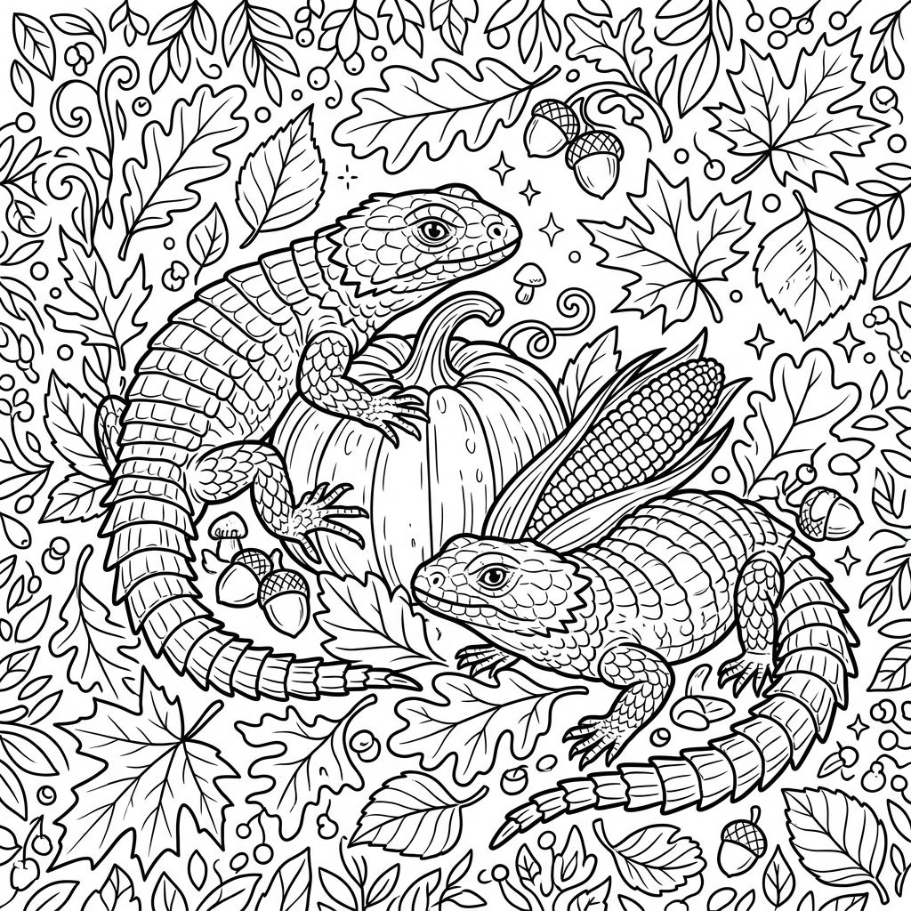 Immerse yourself in the enchanting world of autumn with this captivating coloring page featuring two unique armadillo lizards. Discover a detailed scene filled with seasonal delights, from plump pumpkins to scattered acorns, all waiting for your artistic touch.