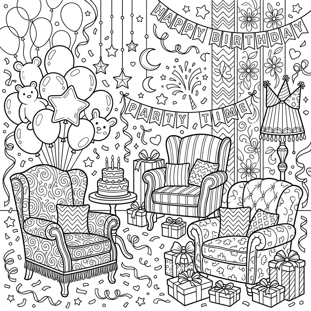 Unleash your inner artist with this engaging template! For the armchairs, consider using a palette of complementary colors to highlight their distinct patterns, or go bold with unexpected hues. Experiment with different shading techniques to give depth to the presents and balloons. Teens might enjoy using fine-tipped markers or colored pencils to tackle the delicate line work and add personalized touches. Whether you prefer vibrant splashes or subtle pastels, this detailed birthday party scene offers endless possibilities for a truly unique masterpiece. Let your creativity flow and make this birthday celebration unforgettable!