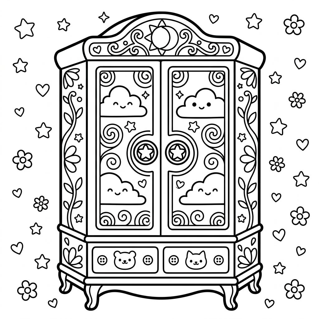 Designed specifically for kids aged 4-8, this coloring page offers a balanced blend of recognizable shapes and moderate detail, making it engaging without being overwhelming. The background is filled with a shower of outlined stars, hearts, and flowers, creating a magical atmosphere that encourages creativity. Imagine this armoire holding not clothes, but dreams, secrets, and all things wonderful – perfect for inspiring stories as your child colors.