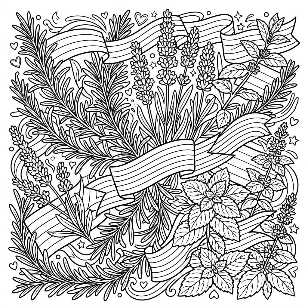 Immerse yourself in a vibrant celebration of nature and diversity with this intricate coloring page. Featuring a lush display of aromatic plants, you'll discover detailed sprigs of fragrant rosemary, elegant lavender blooms, and fresh mint leaves, all meticulously rendered to fill the entire frame. Each botanical element is designed for a rich coloring experience, inviting you to bring its natural beauty to life with your chosen hues.