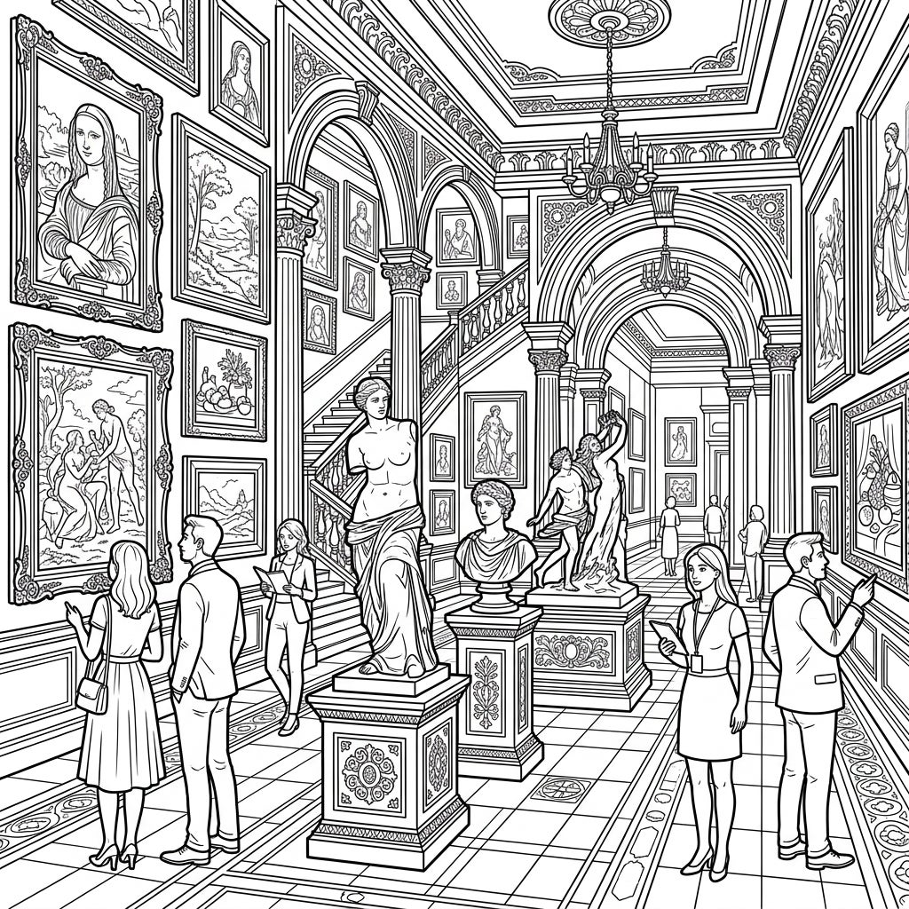 Step into a meticulously detailed art museum, rendered in crisp black and white, waiting for your creative touch. This elaborate coloring page invites you to explore grand halls filled with iconic masterpieces, including a recognizable 'Mona Lisa' and other classical paintings adorning the walls. Observe the elegant sculptures, from draped figures to busts, displayed prominently on ornate pedestals, all framed by stunning architectural elements like arches, columns, and a majestic chandelier.