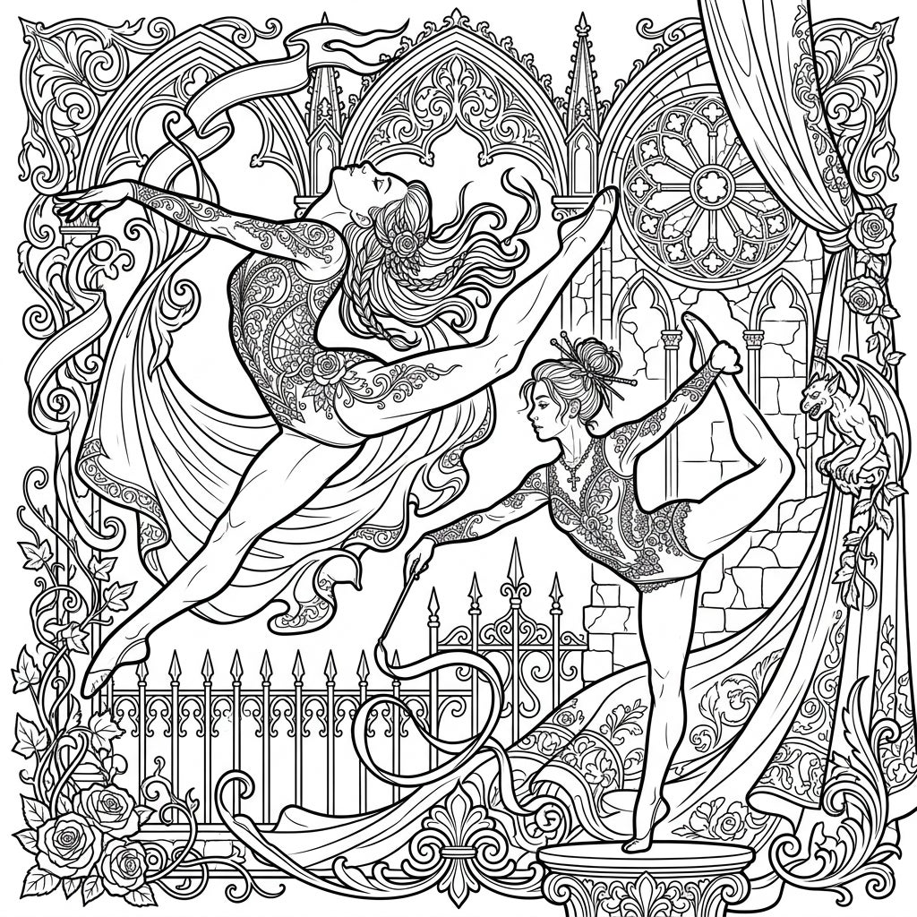 Experience the stunning fusion of athletic grace and dramatic gothic artistry with this captivating coloring page. Delicate patterns on the gymnasts' leotards blend seamlessly with ornate architectural backdrops, inviting you to unleash your creativity.