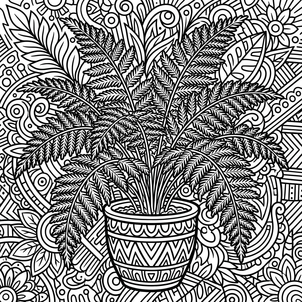 This coloring page isn't just about plants; it's an invitation to a vibrant artistic journey. The energetic Pop Art style, characterized by dynamic graphic elements and an intricately patterned background, transforms the humble fern into a statement piece. It evokes a sense of playful creativity and bold self-expression, making it perfect for those who love both nature and contemporary art. As you fill in the spaces, you'll feel transported to a lively gallery where classic botanical beauty meets urban flair.