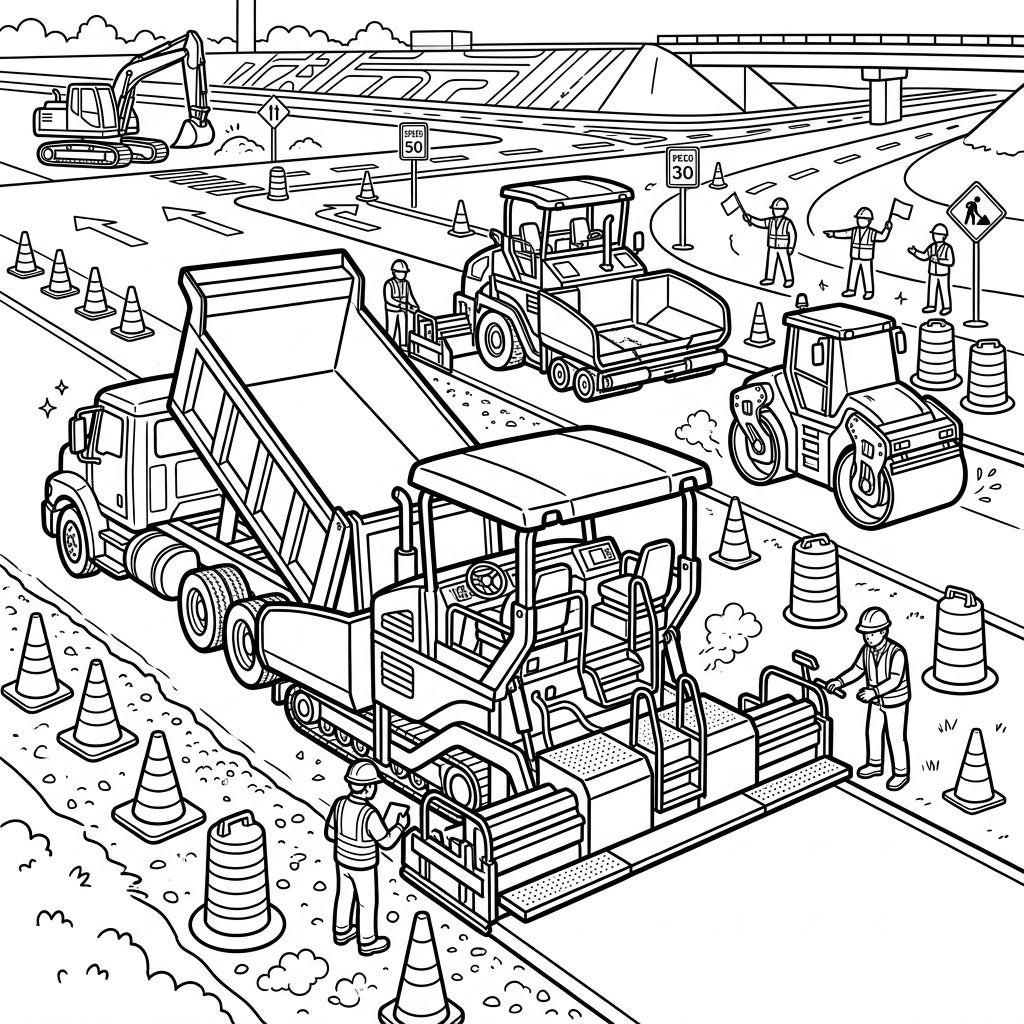 This dynamic coloring page captures the heart of a busy road construction site, brimming with heavy-duty machinery and dedicated workers. At the forefront, an impressive asphalt paver is meticulously laying down fresh asphalt, while a large dump truck expertly delivers its load. In the background, a powerful road roller is compacting the new surface, and an excavator can be seen digging, creating a truly comprehensive scene of progress and industry. The entire area is secured with safety cones and clear road signs, highlighting the careful coordination involved in such significant projects.