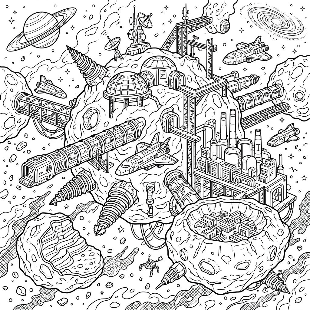 Embark on an epic space journey with this highly detailed coloring page featuring a bustling asteroid mining colony. Discover intricate structures, spaceships, and industrial operations set against the vastness of space.