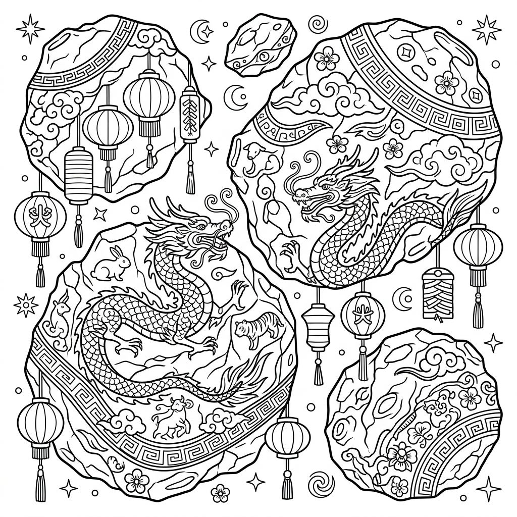 Embark on an epic coloring journey with this unique page featuring asteroids adorned with vibrant Lunar New Year designs. Discover intricate dragons, festive lanterns, and traditional zodiac animals ready for your creative touch.