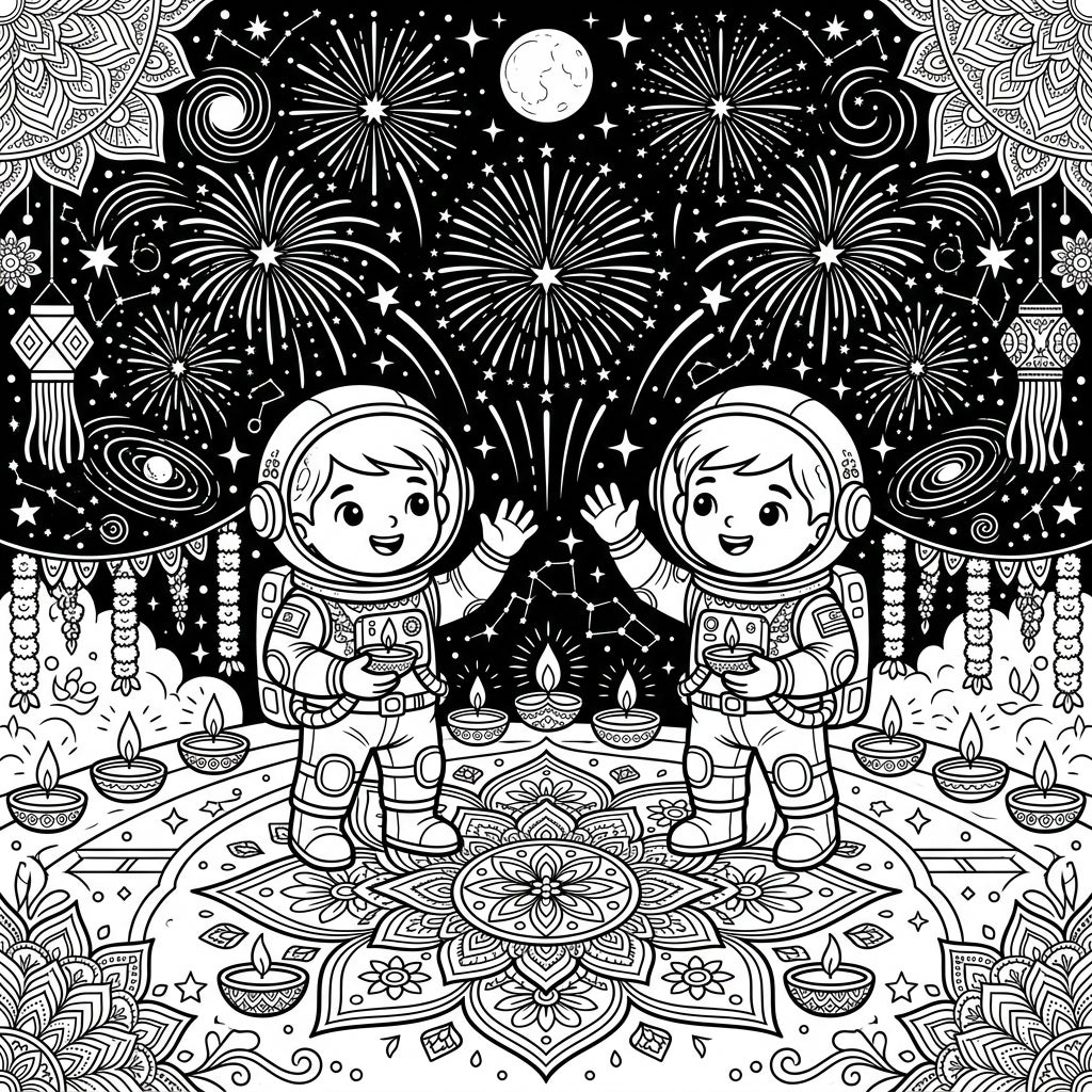 Join two adventurous astronauts as they bring the vibrant spirit of Diwali to the stars! This unique coloring page blends cosmic exploration with traditional festive joy, ready for your creative touch.